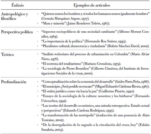 Volviendo a la producción de Cuadernos de Sociología, los énfasis de las reflexiones se pueden organizar en cuatro: los de corte antropológico y filosófico; los de perspectiva política; los teóricos; y los de profundización, como se observa en la siguiente tabla:
