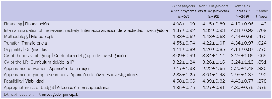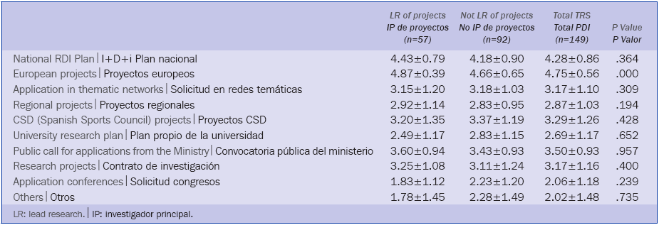 Con relación al profesorado que ha sido IP en algún proyecto de investigación, este considera que los que más importancia deberían tener en las evaluaciones de proyectos serían los internacionales, seguidos de los incluidos en el Plan nacional de I+D+i. Así mismo, el profesorado que no ha sido IP en ningún proyecto opina igual: los más importantes son los internacionales seguidos de los del Plan nacional, aunque existen diferencias estadísticas significativas entre las valoraciones de ambos grupos.