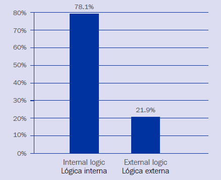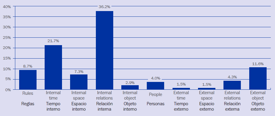 A partir de los resultados obtenidos en el primer nivel de análisis de contenido se han podido realizar análisis estadísticos descriptivos referidos a la lógica interna y la lógica externa (fig. 2). Los resultados que recogen los testimonios de experiencias emocionales de la figura 2 muestran que de 2523 comentarios la mayoría hacen referencia a causas asociadas a la lógica interna (n = 1970 comentarios, 78.1%), aunque también existen testimonios que justifican la vivencia afectiva a la lógica externa (n = 553 comentarios; 21.9%). Del mismo modo el análisis de contenido de 2523 comentarios de los participantes (fig. 3) indica que la mayoría de comentarios justifican la vivencia emocional interna por causas vinculadas a la relación interna (n = 913, 36.2%) y el tiempo interno (n = 547; 21.7%). Esta distribución es muy distinta en los juegos psicomotores en los que la relación interna apenas está presente (ya que se trata de juegos sin interacción motriz) (cf. Lavega & Sáez de Ocáriz, 2013). Estos primeros resultados ya representan un gran avance en la comprensión de las causas que manifiestan los participantes de su experiencia emocional intensa (Lavega & Sáez de Ocáriz, 2013).