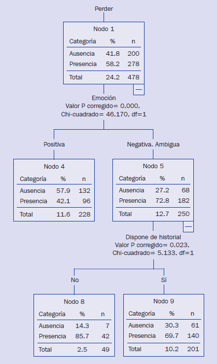Los árboles ordenan las variables en tres niveles jerárquicos (según la capacidad predictiva de esas variables) y establecen para cada variable diferentes nodos en función de si existen diferencias significativas entre las categorías de cada variable (por ejemplo entre emociones positivas, negativas o ambiguas; entre juegos con o sin competición; entre hombres y mujeres…).