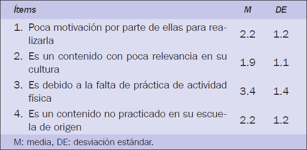 Sobre los contenidos valorados con poca capacidad motriz, el siguiente ítem permite indicar los motivos (tabla 7). Destacan los resultados obtenidos en relación con expresión corporal e higiene corporal: es un contenido con poca relevancia en su cultura y hay poca motivación por parte de ellas para realizarlo. En los contenidos de capacidades físicas y habilidades motrices se escoge un único motivo que hace referencia a la falta de práctica de actividad física.