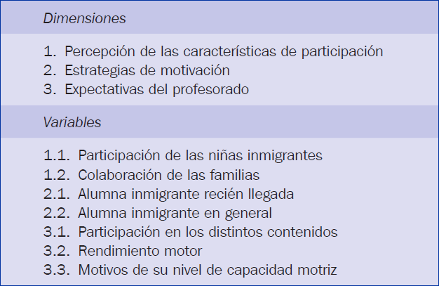 La última dimensión, Expectativas del profesorado, describe la apreciación del especialista en referencia a la participación en los distintos contenidos de EF de las niñas inmigrantes, el rendimiento motor en cada uno de dichos contenidos y los motivos que generan un nivel de capacidad motriz inferior al resto del grupo-clase. (Tabla 1)