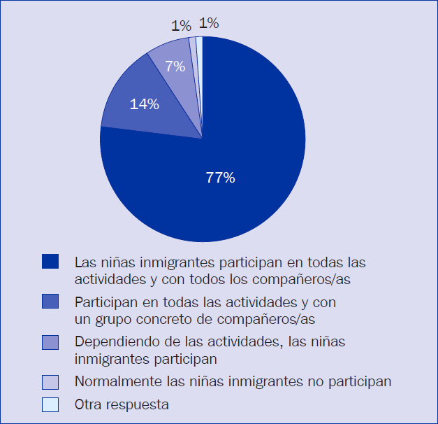 En los resultados obtenidos destaca el hecho de que una mayoría del profesorado (77%) considera que las niñas inmigrantes participan en todas las actividades junto con sus compañeros y compañeras. (Fig. 1)