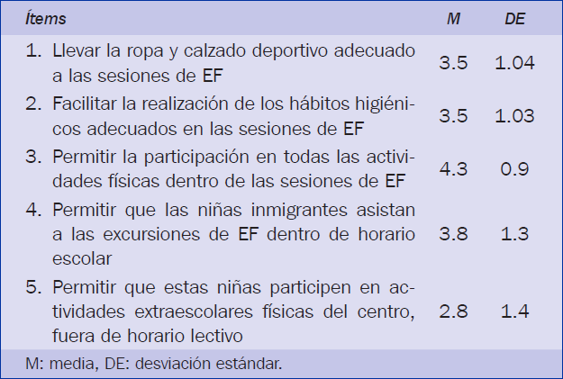 En relación con la colaboración de las familias inmigrantes para obtener un buen proceso de inclusión de las niñas (tabla 2), destaca la opinión positiva de “permitir la participación en todas las actividades físicas dentro de la sesión de EF” (x¯ = 4.3). La acción peor valorada es la referente a la participación en actividades físicas extraescolares, fuera de horario lectivo (x¯ = 2.8).