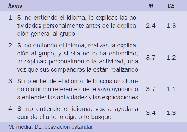 En relación con las intervenciones realizadas hacia el alumnado femenino recién llegado (tabla 3), la estrategia más utilizada es la de explicar la actividad al grupo, y si ella no la ha entendido, explicársela personalmente una vez que sus compañeros y compañeras la están realizando (x¯ = 3.7). Otras estrategias escogidas son la de buscarle un alumno o alumna referente (x¯ = 3.7) y ayudarle cuando ella se lo diga o le busque (x¯ = 3.4). La intervención menos utilizada es la de explicar las actividades personalmente antes de la explicación general al grupo (x¯ = 2.4).