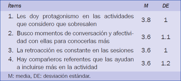 En referencia a las estrategias de motivación utilizadas para mejorar la inclusión de las niñas inmigrantes (tabla 4), la intervención mejor valorada es la de darle protagonismo en aquellas actividades en las que ellas sobresalen (x¯ = 3.8). Las siguientes estrategias obtienen una valoración similar: a) utilizar alumnas y alumnos referentes (x¯ = 3.6); b) buscar momentos de conversación y afectividad con ellas para conocerlas mejor (x¯ = 3.6), y c) realizar una retroacción constante (x¯ = 3.6).