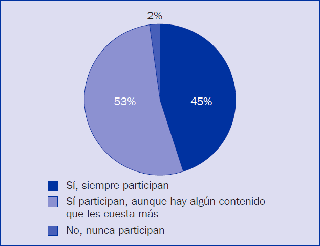 El 45% del profesorado indica una buena participación de las niñas inmigrantes en relación con el grupo-clase; no obstante, existe un porcentaje más elevado de maestros y maestras (53%) que señalan una participación inferior por parte de estas chicas en algún contenido del área de EF (fig. 2).