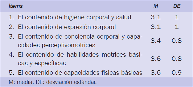 El 53% del profesorado que contesta que hay algún contenido que les cuesta más debe especificar en la siguiente pregunta cuáles son estos contenidos (1 = les cuesta mucho participar; 5 = la participación es la misma que el resto del grupo) (tabla 5). Los contenidos que obtienen una mayor puntuación son las capacidades físicas básicas (x¯ = 4.1) y las habilidades motrices (x¯ = 4). Por el contrario, el profesorado considera que las niñas inmigrantes tienen una menor participación en los contenidos de expresión corporal (x¯ = 2.98) e higiene corporal y salud (x¯ = 3.1).