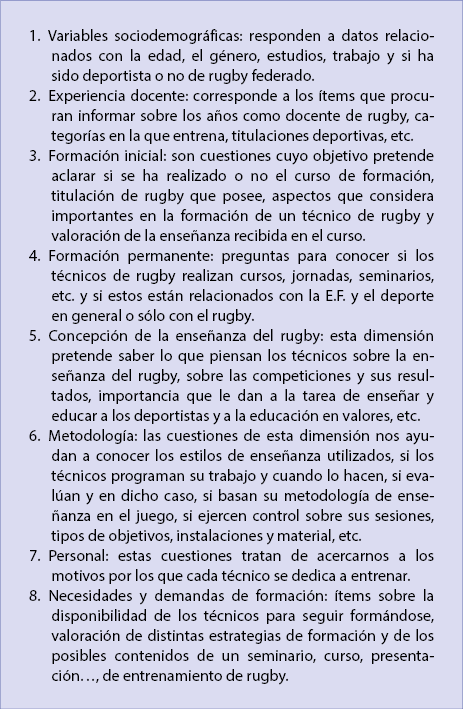 Se trata de un diseño de naturaleza no experimental y de carácter transversal, cuyo procedimiento de recogida de información se realiza mediante una encuesta, utilizando la técnica del cuestionario (Hernández-Sampieri, 2014). Se elaboró un cuestionario adaptado de Abad (2010) que pasó un estudio Delphi con 15 expertos en formación de rugby para comprobar su validez siguiendo los criterios iniciales de selección de Cabero y Osuna (2013). El instrumento denominado QUGRAFOR®, se compone de 21 ítems que están agrupados en ocho ámbitos o dimensiones (López, Vázquez, & Jaenes, 2017)(tabla 1). A continuación, se realizó la selección de la población, entrenadores de rugby de la provincia de Cádiz. El muestreo empleado en el presente estudio es no probabilístico, casual o de muestreo por accesibilidad (Bisquerra, 2004). Completaron la encuesta un total de 50 entrenadores.