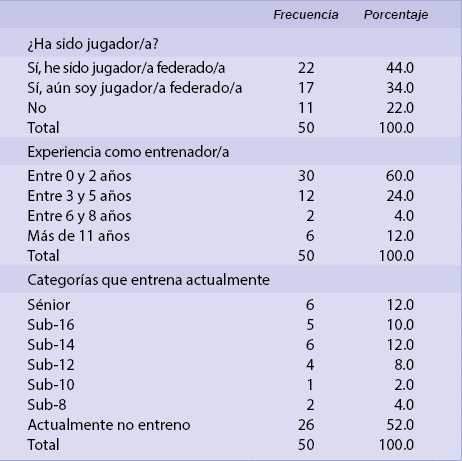 Los datos descriptivos recogidos en el cuestionario QUGRAFOR® indican que han participado 50 entrenadores, 46 hombres (92%) y 4 mujeres (8%), correspondientes a 6 clubes de la provincia de Cádiz. La mayoría de los sujetos encuestados (40%) tenían entre 21-30 años de edad (DE = 1.04). La distribución de las edades se puede observar en la tabla 2.