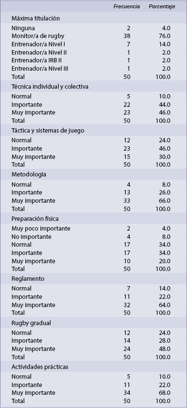 Respecto a la dimensión Formación previa (tablas 4,5 y 6), en el ítem Máxima titulación, el 76% (f = 38) posee el título de monitor de rugby. En el ítem relacionado con la valoración de los contenidos recibidos durante los cursos de entrenadores, el 46% (f = 23) consideran muy importante los contenidos de Técnica individual y colectiva; el 46% (f = 23) consideran importante el aprendizaje de la táctica y sistemas de juego; el 66% (f = 33) consideran muy importante el aprendizaje de la Metodología de enseñanza; el 34% (f = 17) consideran como normal el aprendizaje de la Preparación física; el 20% (f = 10) como muy importante; el 64% (f = 32) de los encuestados consideran como muy importante el aprendizaje del Reglamento; respecto al Rugby gradual, el 48% (f = 27) responde muy importante; y, por último, el 68% (f = 34) indican muy importante la realización de Actividades prácticas.