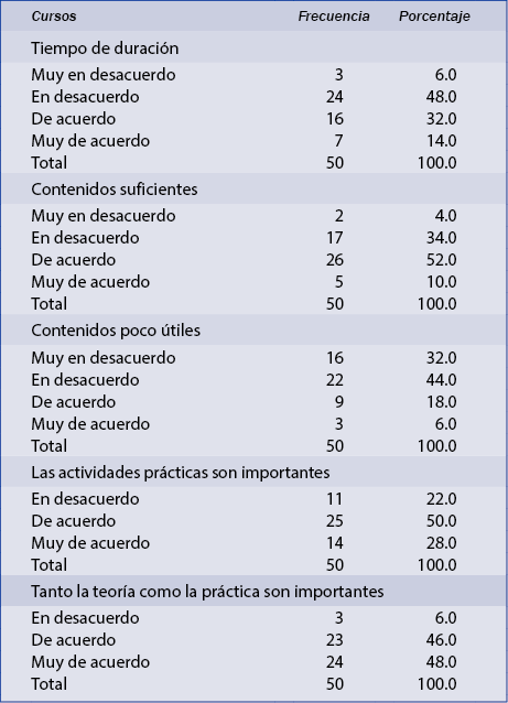 Las respuestas en relación con la organización de los cursos de formación se reflejan en la tabla 5. El 48% (f = 24) de los encuestados responden en desacuerdo con el Tiempo de duración de los cursos; el 52% (f = 26) responden de acuerdo al ítem Contenidos de los cursos son suficientes; el 44% (f = 22) de los entrenadores/as indican en desacuerdo al ítem Contenidos de los cursos son poco útiles; el 50% (f = 25) de las respuestas son de acuerdo al ítem Las actividades prácticas de los cursos son importantes; respecto al ítem Tanto la Teoría como la práctica de los cursos fueron importantes, el 48% (f = 24) indica muy de acuerdo.