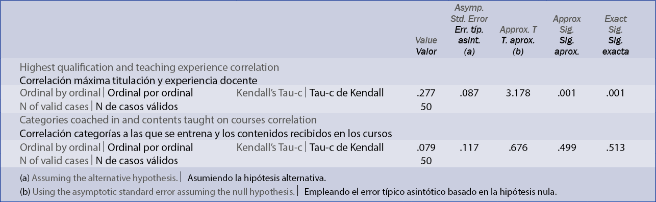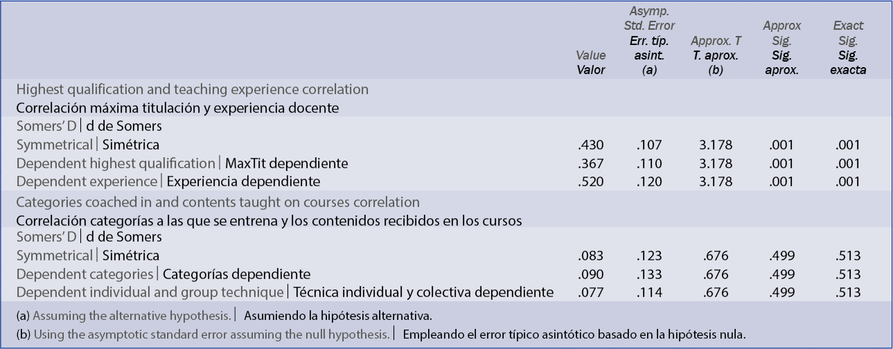 De igual modo, las categorías a las que entrena y los contenidos recibidos durante los cursos realizados más importantes han sido la técnica individual y colectiva no están asociados de forma significativa, (d = 0.083 con p < 0.513; Tau-c = 0.079 con p < 0.513) (tablas 7y 8).