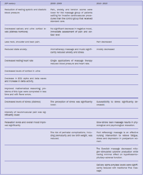 Abstract: A study was carried out to update knowledge about massage in managing chronic stress at the international level through a documentary and literature review of scientific articles published until December 2015. The databases consulted were Medline, Scopus and Scielo. The keywords ‘estrés’, ‘stress’, ‘masaje’ and ‘massage’ were used in Spanish and English. 32 studies were found, 1 of them meta-analysis, 1 review and 30 for application at the various levels of experimentation (pre, quasi, and experimental) in determining the effectiveness of massage in coping with stress at the international level. These were analyzed in three stages: studies carried out in the 20th century; and of the 21st century, in the periods from 2000 to 2009 and from 2010 to 2015. The studies found suggest that massage applied in different ways is effective in managing chronic stress and its negative effects