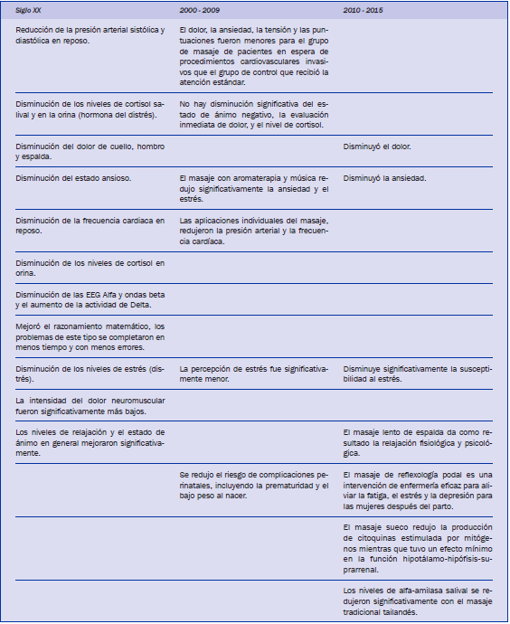 En un análisis general, se puede observar que la mayor coincidencia de resultados se presenta en la reducción de la presión arterial sistólica y diastólica en reposo, disminución del dolor de cuello, hombro y espalda, disminución del estado ansioso, disminución de la frecuencia cardiaca en reposo, disminución de los niveles de estrés (distrés), la intensidad del dolor neuromuscular fueron significativamente más bajos, los niveles de relajación y el estado de ánimo en general mejoraron significativamente. Todas las investigaciones encontradas exponen los beneficios y efectividad del masaje con resultados en estas áreas.