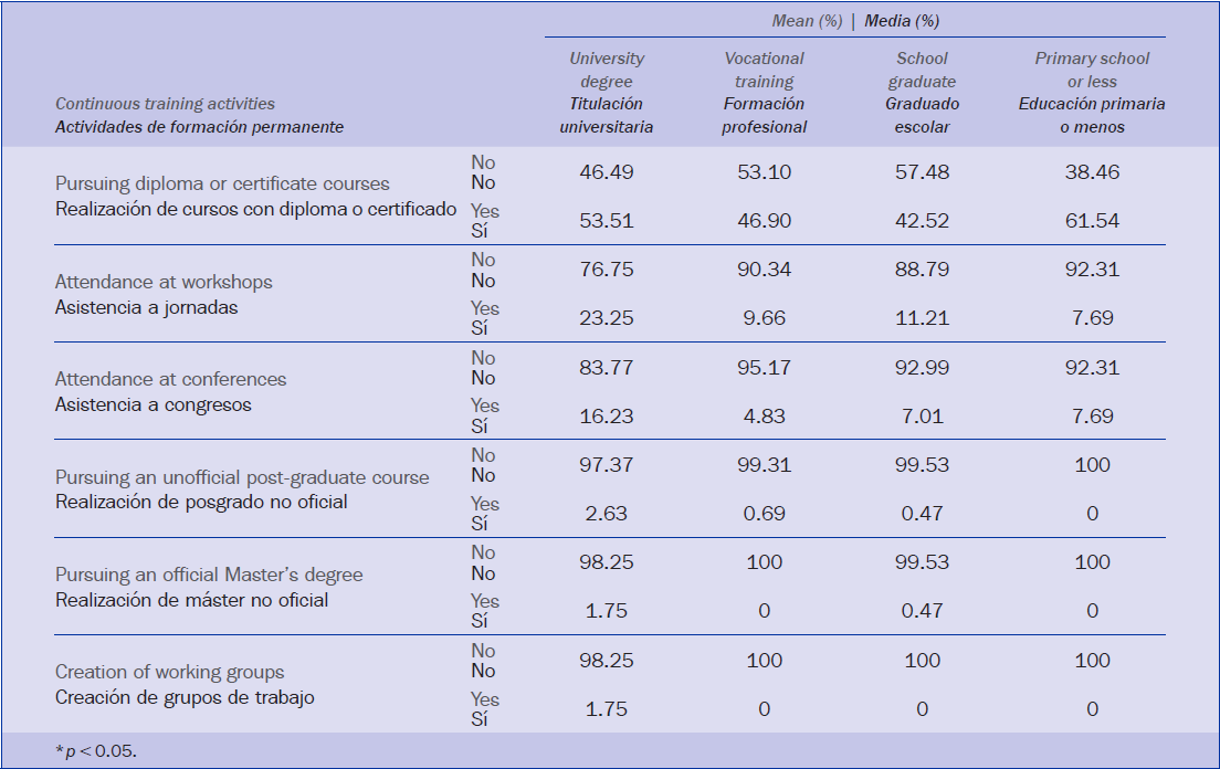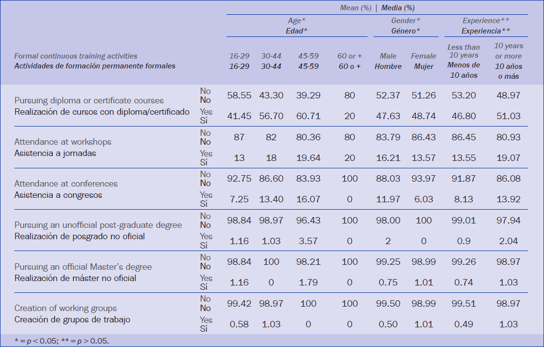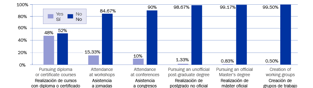 En el presente estudio se obtiene que los cursos con diploma o certificado fue la formación formal a la que más asistieron, prevaleciendo sobre otros tipos como son, por orden de frecuencia, asistencia a jornadas, asistencia a congresos, realización de posgrado no oficial, realización de máster oficial y realización de grupos de trabajo. Estas tres últimas actividades fueron minoritarias ya que son más especializadas, esporádicas y más caras, además requieren más inversión de tiempo.