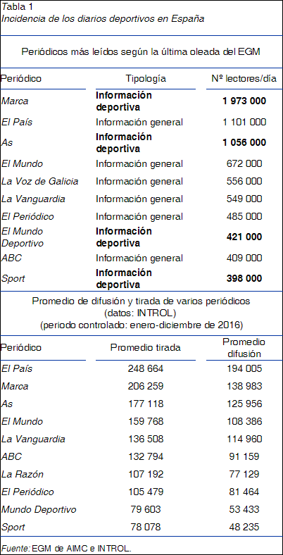 En España, partiendo de los datos del último Estudio General de Medios (EGM) de la Asociación para la Investigación de Medios de Comunicación (AIMC) e Información y Control de Publicaciones (INTROL), entre los 10 periódicos más vendidos y leídos, se encuentran cuatro de información deportiva. Se trata de los periódicos Marca, As, Mundo Deportivo y Sport (tabla 1).