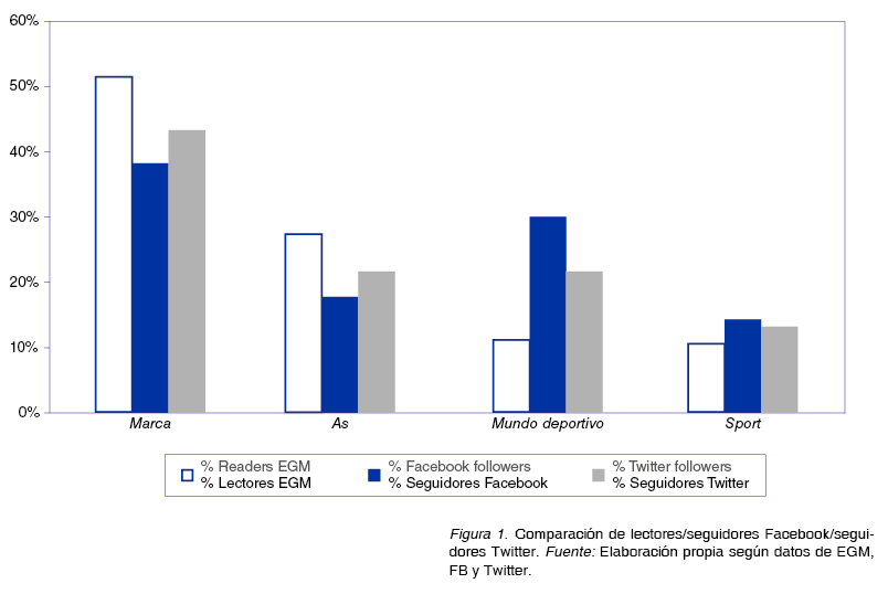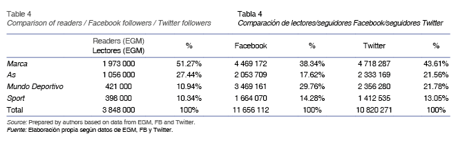 Resumen: Los periódicos Marca, As, Mundo Deportivo y Sport son los cuatro periódicos deportivos más leídos en España, con presencia en las redes sociales Facebook y Twitter. Este artículo presenta resultados que comparan su número de lectores con respecto a su número de seguidores en las redes sociales. Igualmente se indaga sobre los niveles de interacción que existen con sus usuarios. Para realizar el estudio se ha seguido una metodología cuantitativa pues se considera al análisis de contenido como el método más fiable para el fin perseguido. Una de las principales conclusiones indica que los seguidores en redes sociales no se corresponden con su número de lectores en periódico-papel. Otra informa sobre el bajo nivel de interacción.