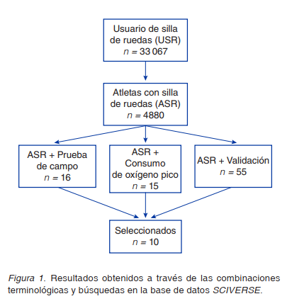 Se realizó una búsqueda en profundidad con las siguientes combinaciones de palabras clave: “Wheelchair Users” sumado a “Spinal Cord Injury” cuya finalidad era verificar la cantidad de artículos, conferencias y tesis doctorales que estaban relacionadas con los usuarios de silla de ruedas con LME en términos generales. Después se efectuó una búsqueda a través de las siguientes combinaciones terminológicas: “Wheelchair Users”, combinados con “Field Test”, “Validation” y “Peak Oxygen Consumption”, para el análisis de estudios relacionados con la construcción de pruebas de campo para la evaluación de la potencia aeróbica en atletas con discapacidad física.