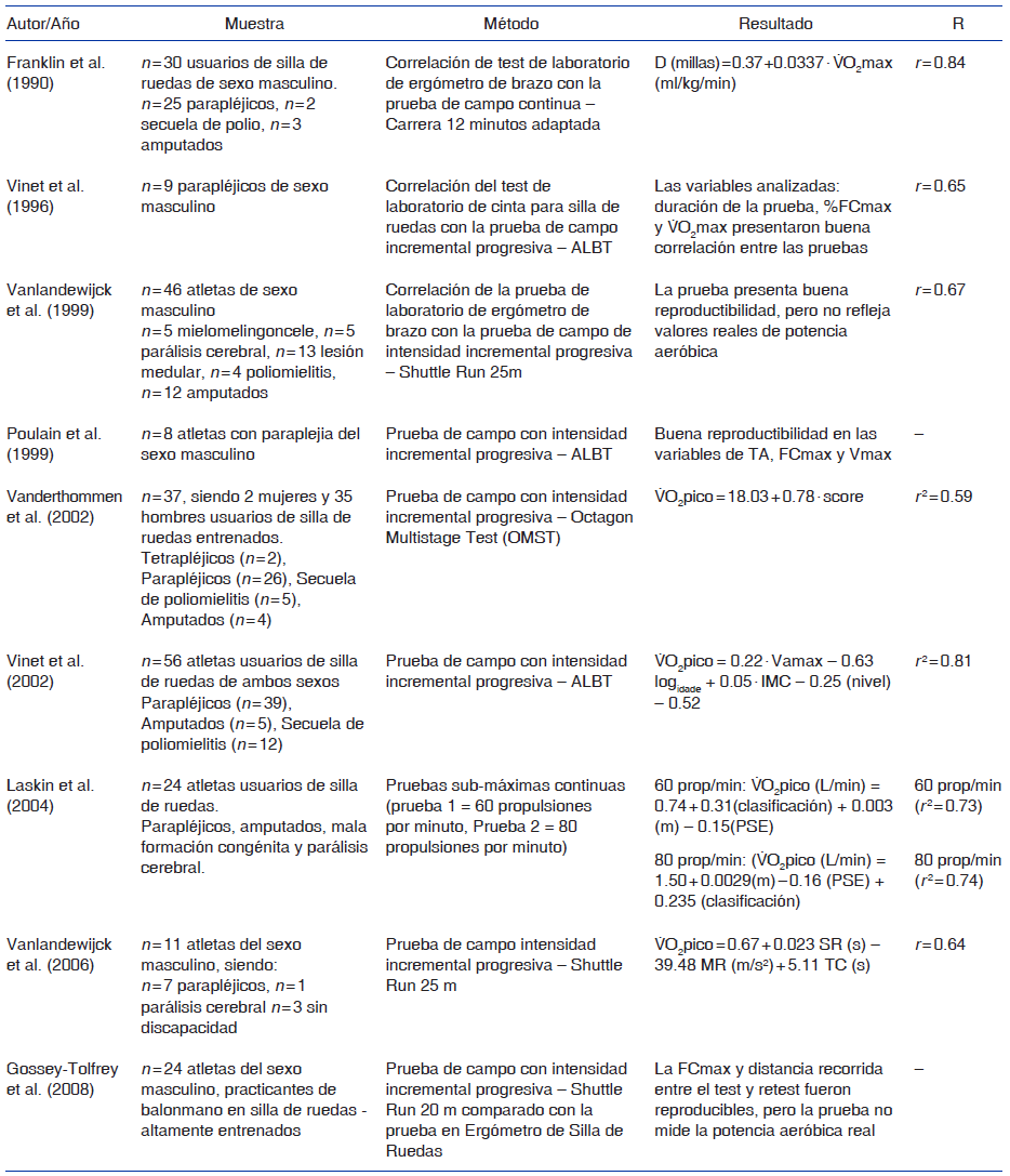 Franklin et al. (1990) correlacionaron los valores de V. O2pico. obtenidos a través del ergómetro de brazo y encontraron correlación moderada (r = 0.84). Años más tarde, Vinet et al. (2002) correlacionaron los valores de V. O2pico obtenidos en la prueba ALBT (Adapted Leger and Boucher Test para atletas dependientes con silla de ruedas) en la pista de tartán con los valores obtenidos en el ergoespirómetro portátil e identificaron correlación moderada de (r2 = 0.81). Por otro lado, estudios como los de Vanderthomenn et al. (2002); Vanlandewijck et al. (2006); Vinet et al. (1996) presentaron correlaciones más pequeñas que r = 0.69 en la medición de V. O2pico en pruebas de campo, lo que requiere tener por parte de los evaluadores cierto cuidado en la interpretación de los resultados para no sobreestimar la real potencia aeróbica de los atletas con tetraplejía, dado que son evaluados e insertados en grupos de muestreo con sujetos amputados, con secuelas de poliomielitis, parapléjicos o incluso individuos sin discapacidad (Goosey-Tolfrey et al., 2006;Vanlandewijck et al., 2006).