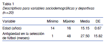 Se evaluaron 20 jóvenes futbolistas de la selección prejuvenil masculina del Departamento de Risaralda (Colombia), con un promedio de edad de 15.2 años y una media de antigüedad en las escuelas de fútbol de 27.5 meses (tabla 1). El 45% jugaban como centrocampistas, el 35% como defensas, el 15% como delanteros y el 5% como guardameta.