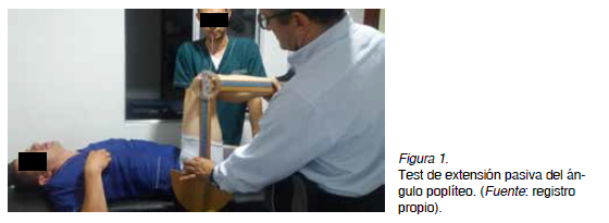 A cada grupo de extremidades se midió el ángulo poplíteo antes y después de la intervención, o sea, antes de la primera sesión y después de la sesión 36 (pretest y postest). Se contó con enmascaramiento simple, en este caso del equipo evaluador. El evaluador principal fue un médico deportivo con la asistencia de un fisioterapeuta, que fueron entrenados previamente mediante la realización de 32 test. Se fijó la pelvis para minimizar el efecto del cambio de su posición sobre el ángulo poplíteo (Herrington, 2013; Sullivan, Dejulia y Worrell, 1992).
