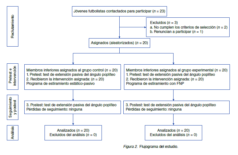 Se contó con la participación de jóvenes que cumplían los criterios de inclusión y aceptaron su vinculación mediante consentimiento informado, asentimiento de padres de familia y autorización de directivas de la Liga Risaraldense de Fútbol. Los participantes debían ser hombres de 14 a 16 años, con una vinculación mínima de un mes en la selección Risaralda y que jugaran a fútbol como mínimo tres veces por semana. Se excluyeron aquellos con lesiones de miembros inferiores sufridas en los últimos seis meses y los que no presentaban retracción de isquiosurales. El cálculo del tamaño de la muestra se realizó con un nivel de confianza del 95%, un poder estadístico del 80%, una diferencia esperada entre grupos de 8° de flexión de rodilla y una desviación estándar de referencia de 8.93° según lo reportado por Puentedura et al. (2011) para una muestra mínima de 20 miembros inferiores en cada grupo: control y experimental.