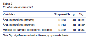 Se realizó la descripción de las mediciones del ángulo poplíteo y se realizaron pruebas de normalidad Shapiro-Wilk para los distintos test, encontrando que la medida en el pretest y la medida de cambio entre el pretest y postest para muestras independientes (control y experimental) se distribuye normalmente (tabla 2). Se valoró la diferencia entre grupos a través de pruebas de homogeneidad bilateral para muestras independientes (t de Student) y para muestras relacionadas (prueba de rangos con signo de Wilcoxon). Se aceptaron diferencias cuando la significación asintótica bilateral fue igual o menor a .05. Para el procesamiento de la información se utilizó el programa estadístico SPSS 23.0 (Statistical Package for the Social Science). No se presentaron datos perdidos en el procesamiento de información.