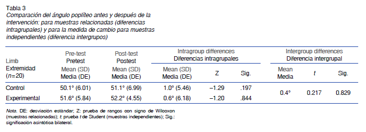 Diferencia de muestras relacionadas (diferencia entre pretest y postest). Como se aprecia en la tabla 3, tanto en el grupo control como en el experimental, las medidas postest del ángulo poplíteo mejoraron muy poco respecto al pretest. En ninguno de los grupos de extremidades la diferencia fue estadísticamente significativa (p > .05).