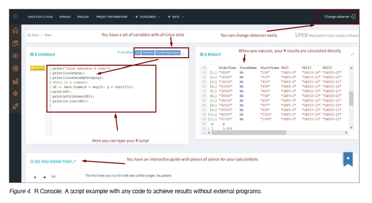 Considering the emergence of the R language created by Ihaka (Ihaka & Gentleman, 1996) and its wide use in research for data analysis algorithms in many scientific fields (Morandat et al., 2012), LINCE PLUS has a component to launch R code through the web interface. Although it has the limitation of not being able to launch the powerful charts of R Studio, researchers code their code easily and see the result in the output component in text mode. Researchers can access the observation register and the instrument without having to use external software and all guaranteeing the privacy of the study.