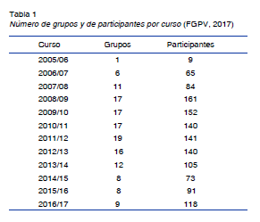 El primer curso organizado en la temporada 2005/06 contó con nueve participantes inscritas en un único grupo y a partir de esa temporada, fueron aumentando considerablemente el número de grupos y de participantes (tabla 1). Cabe destacar que el programa responde a un número cuantioso de mujeres que hasta el año 2005 no disponían de ninguna oferta recreativa organizada y lúdica para practicar pelota vasca.