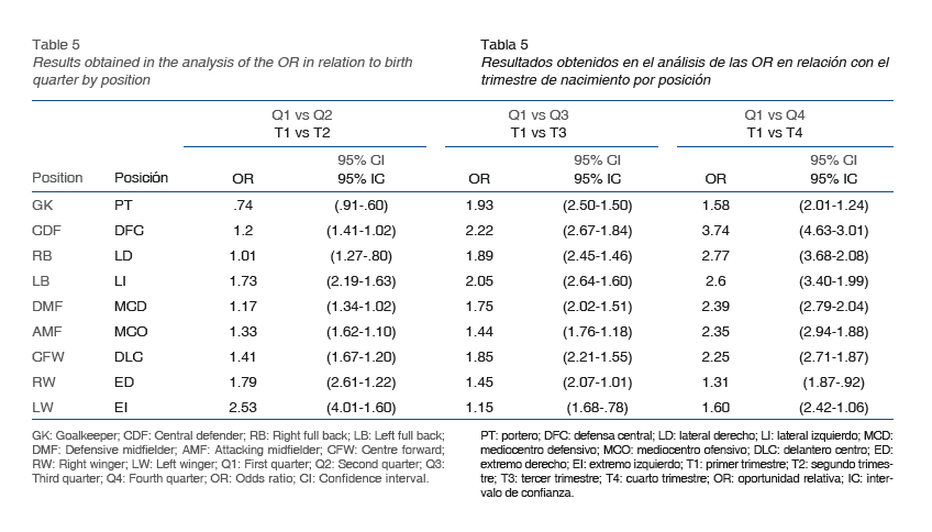 En la tabla 5 se muestran los resultados obtenidos en las OR con un intervalo de confianza (IC) del 95%, según la posición y el trimestre de nacimiento. Analizando los resultados obtenidos por trimestres se puede observar que la OR se va incrementando a medida que se compara el primer trimestre con el más alejado (T4), siendo la OR que compara T1 y T4 la más elevada en todas las posiciones excepto PT, ED y EI.