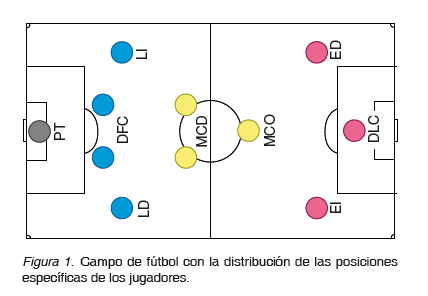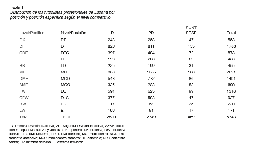 Los datos de un total de 5748 futbolistas profesionales con licencia federativa en la RFEF fueron recogidos en una base de datos creada ad hoc. Dichos jugadores pertenecían a la Primera División Nacional (1D), Segunda División Nacional (2D) y selecciones españolas sub-21 y absoluta (SESP). Los jugadores fueron divididos en función de su fecha de nacimiento según el trimestre: T1 (enero, febrero y marzo), T2 (abril, mayo y junio), T3 (julio, agosto y septiembre), y T4 (octubre, noviembre y diciembre) y según el semestre: S1 (T1+T2) y S2 (T3+T4). Además, los jugadores fueron distribuidos en las siguientes posiciones generales: porteros (PT), defensas (DF), mediocentros (MC) y delanteros (DL) tomando como referencia la base de datos de la Liga de Fútbol Profesional (LFP). Posteriormente, estas posiciones generales se subdividieron en posiciones más específicas según se detalla a continuación: defensa central (DFC), lateral izquierdo (LI), lateral derecho (LD), mediocentro defensivo (MCD), mediocentro ofensivo (MCO), delantero centro (DLC), extremo derecho (ED) y extremo izquierdo (EI). Para ello, se formó una comisión de la que formaban parte los autores de este estudio, así como cinco entrenadores nacionales de fútbol, y se clasificaron clasificando a los jugadores en función de una serie de criterios previamente acordados. En la tabla 1 se muestra la distribución final de los futbolistas por posiciones y por niveles competitivos, y en la figura 1 la localización de esas posiciones específicas en el terreno de juego.