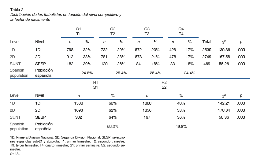 En la tabla 2 se recogen los resultados obtenidos según la distribución de las fechas de nacimiento en función del nivel competitivo por trimestres y semestres en todos los subgrupos y en la población española general. Los resultados registrados en el análisis ji cuadrado revelan la existencia de diferencias significativas en la distribución de fechas de nacimiento en todos los niveles competitivos cuando estas se comparan con la población española, tanto por trimestres como por semestres. T1 y T2 en trimestres y S1 en semestres aparecen siempre sobrerrepresentados (figuras 2y 3).