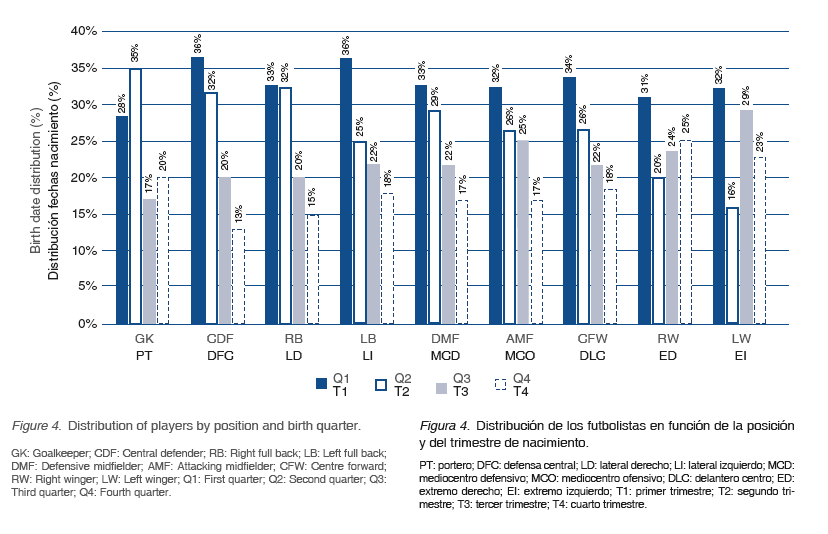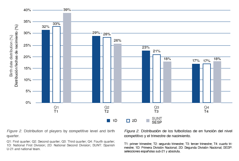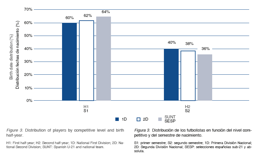 A pesar de que hay trabajos anteriores efectuados también en fútbol masculino español que no reflejan la existencia clara de este efecto (Martin-Acero et al., 2005), si se comparan los resultados obtenidos en el presente estudio con otros realizados en España o en otras ligas europeas se puede señalar que el RAE es un problema persistente en esta modalidad deportiva, tanto en hombres como en mujeres (Cobley et al., 2008; González-Víllora et al., 2015; Lesma et al., 2011;Mujika et al., 2009; Pérez-Jiménez y Pain, 2008; Sedano et al., 2015; Williams, 2010). De hecho, analizando los resultados en profundidad, se puede afirmar que los jugadores nacidos en el primer trimestre del año suponen casi el doble que los nacidos en el último trimestre, existiendo más de un 20% de diferencia entre el primer y el segundo semestre. Dichos datos se asemejan mucho a los obtenidos recientemente por Lesma et al. (2011) en jugadores españoles de primera división con datos referidos en su caso a la temporada 2009-10.