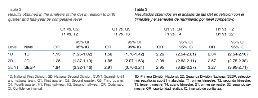 En la tabla 3 se muestran los resultados obtenidos en las OR con un intervalo de confianza (IC) del 95%, según el nivel competitivo y el trimestre y el semestre de nacimiento. Analizando los resultados obtenidos por trimestres, podemos observar, que la OR se va incrementando a medida que se compara el primer trimestre con el más alejado (T4), siendo la OR que compara T1 y T4 la más elevada en todos los niveles competitivos. Teniendo en cuenta el nivel competitivo, las OR que comparan T1 y T4 y S1 y S2 son más elevadas en el caso de los jugadores del grupo de selección española