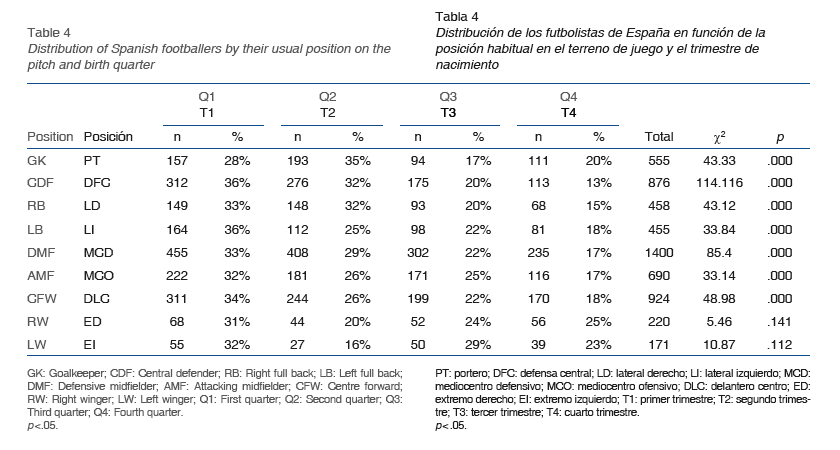 Otro de los objetivos de esta investigación era valorar cuanto influye la posición ocupada habitualmente en el terreno de juego en la incidencia del RAE, ya que hay autorías que han afirmado que hay ciertas posiciones donde este fenómeno se manifiesta con mayor magnitud debido a las mayores exigencias físicas, especialmente de la capacidad de fuerza (Romann y Fuchslocher, 2011;Schorer et al., 2009; Sedano et al., 2015;Till et al., 2010). El análisis pormenorizado de los resultados conduce a señalar que el RAE se manifiesta en todas las posiciones específicas, a excepción de los extremos. La mayor incidencia del RAE se produce en el grupo de los defensas centrales, algo que está en línea con lo mostrado por otros autores que efectúan estudios en fútbol español (Lesma et al., 2011;Prieto-Ayuso et al., 2015;Sedano et al., 2015). Sin embargo, llama la atención que en estos trabajos también aparezca destacada la figura del portero, posición que tradicionalmente se ha calificado como de mayor demanda física y antropométrica (Di Salvo y Pigozzi, 1998). En la presente muestra, el portero registra una incidencia más baja de RAE que los laterales, los mediocentros y los delanteros centro. Por otra parte, la única posición que no se ve afectada de manera significativa por el RAE es la de los extremos, tanto izquierdo como derecho. Se ha señalado que la mayor incidencia del RAE en ciertas posiciones podía vincularse al proceso de selección en el que los entrenadores buscan jugadores más desarrollados físicamente para cubrir ciertas posiciones, sin embargo, a la vista de los resultados, no se puede afirmar categóricamente que esto sea así en el fútbol profesional español.