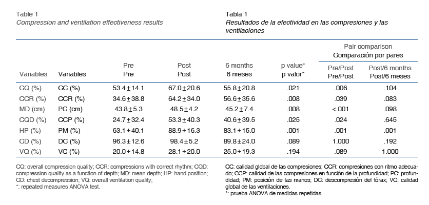 El ANOVA de 1 (grupo) y 3 (tiempos) mostró diferencias estadísticamente significativas en cinco variables relacionadas con las compresiones: la calidad global de las compresiones (CC) (F2.46 = 4.227; p = .021); las compresiones con ritmo correcto (CCR) (F2.46 = 5.352; p = .008); la profundidad media (PC) (F2.46f = 5.364; p = .008); la calidad de las compresiones en función de la profundidad (CCP) (F2.46 = 3.998; p = .025), y la posición de las manos (PM) (F2.46 = 13.179; p < .001). Las diferencias en la descompresión de tórax (DC) (F2.46 = 2.557; p = .089) y en la calidad de las ventilaciones (VC) (F2.46 = 2.132; p = .194) no fueron significativas en ninguno de los tres test. Todos los resultados relacionados con las compresiones y las ventilaciones se pueden visualizar en la tabla 1.