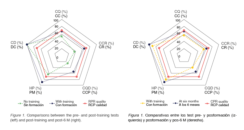 La calidad media de la RCP alcanzada tras la formación en este trabajo (67 %) fue similar a la conseguida en otros estudios con una mayor duración (profesores; 80 minutos; 69 %) (Pichel-López et al., 2018) y superior a la de otros (estudiantes del Máster Oficial de Profesorado; 120 minutos; 53 %) (Navarro-Patón et al., 2017).