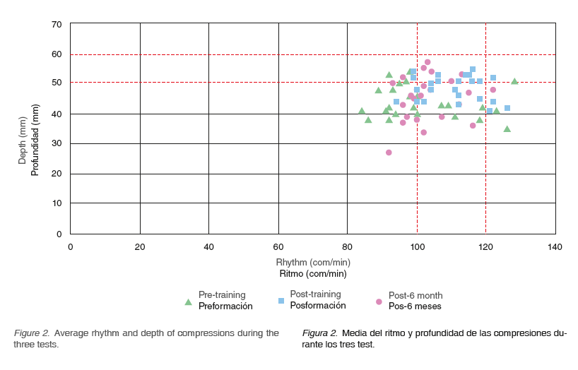 En la figura 2 se puede comprobar como antes de la formación ningún participante consigue alcanzar una profundidad adecuada de 5 cm mientras mantiene el ritmo correcto de 100-120 com · min–1. Sin embargo, tras los 45 minutos de entrenamiento, el 37.5 % de los participantes lo consigue (p = .003). Tras 6 meses de desentrenamiento, un 20.8 % de los participantes siguen alcanzando dichos valores no habiendo cambios significativos con respecto al test posformación (p = .485).