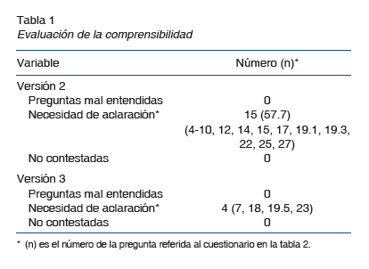 En la segunda fase de validación se administró el cuestionario a 26 participantes, y se anotaron las preguntas que necesitaron una aclaración. En la primera administración (versión 2) 15 preguntas de las 35 totales requirieron de aclaración por parte de entre 1 y 3 personas. En la segunda administración (versión 3), solo se anotaron cuatro aclaraciones menores por parte de dos alumnos (tabla 1). En resumen, de las 910 respuestas obtenidas (26 participantes × 35 variables), solo se requirieron 5 aclaraciones, por lo tanto, la comprensibilidad del cuestionario fue prácticamente del 100%