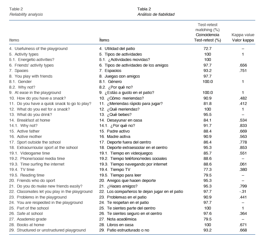 Abstract: The aim of this study is to present the validation of a questionnaire to obtain objective data showing which aspects affect and can be improved in relation to the physical and emotional health of students between 6 and 12 years old during recess time in order to design changes in educational aspects. The 29-question survey seeks to reveal, through comprehensibility and internal validation, aspects related to wellbeing, health, relationships and physical activity during leisure time at school. The study was conducted in a school in Majorca using a random cluster sampling technique. In the first and second stages, 26 and 44 students, respectively, were selected from the fifth and sixth years of primary education. The questionnaire was validated through discussion by a panel of experts, an initial test of comprehensibility and the viability of the data collection methodology, and a test/ re-test to assess its reliability, consistency and validity. The results in terms of the questionnaire’s comprehensibility are extremely satisfactory, as virtually all the questions were understood by the study sample. Content validity is also very high, with mean concordance values of 92.2% and mean kappa values of .64. Therefore, we can say that understanding is extremely satisfactory and reliability is excellent.