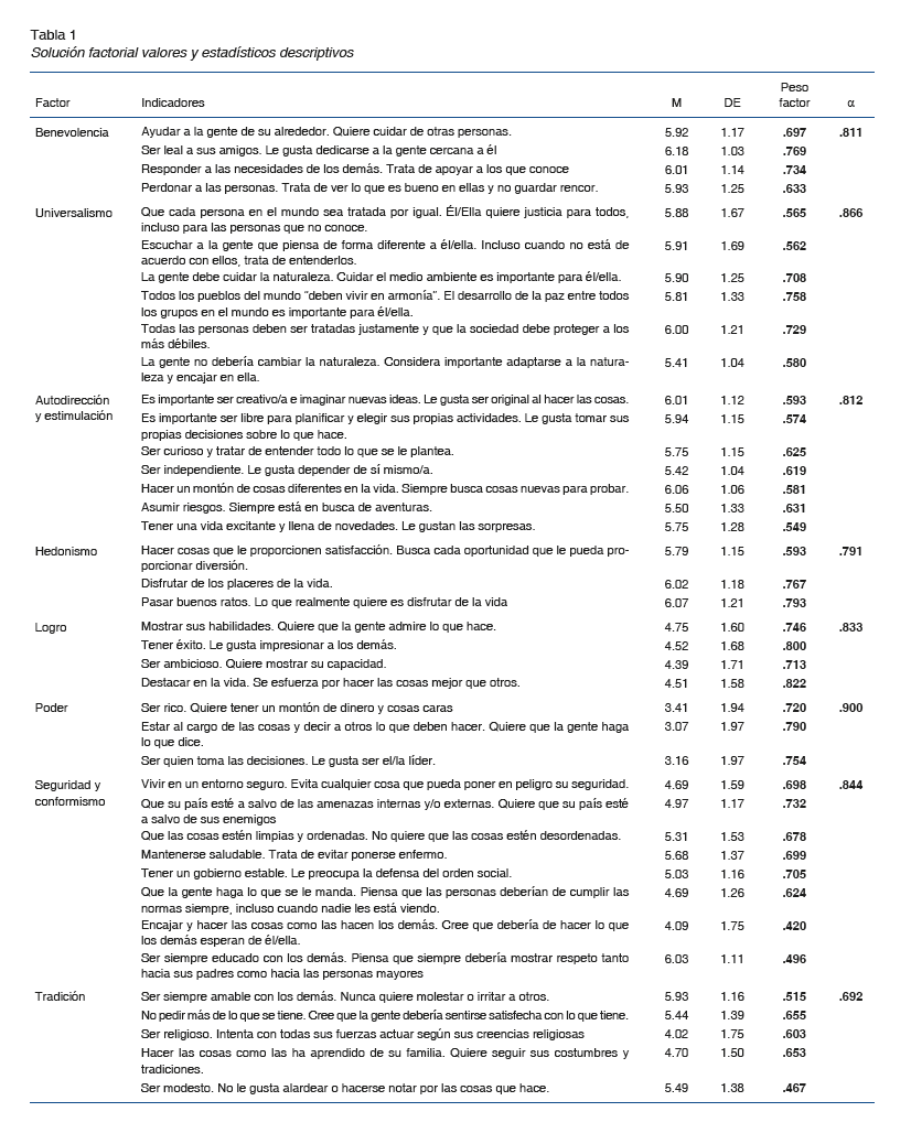 (2) Valores: se utilizó la escala de valores de Schwartz et al. (PVQ) (2001) validada y confirmada por diversos estudios académicos y científicos. La PVQ se basa en la Schwartz Value Survey (SVS), que ha sido aplicada en numerosas ocasiones mostrando una alta validez transcultural (Spini, 2003). Ha sido probada en más de 200 muestras en más de 60 países y utilizada para explicar un amplio rango de actitudes y comportamientos en distintos países (Schwartz y Bardi, 2001). La versión española de la PVQ ha sido validada por Saiz (2009). Se presenta una adaptación transcultural de la PVQ al español para pretender asegurar una equivalencia lingüística, semántica y cultural de esta escala.