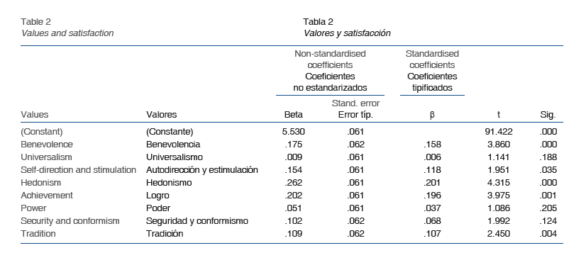 4º. Autodirección y estimulación (p<.05). La curiosidad, la independencia y la libertad se relacionan con la satisfacción. Sorprende como la estimulación que comprende el hecho de asumir nuevos riesgos o realizar actividades diferentes en la vida ocupa el cuarto lugar en tanto que el hedonismo se encuentra en primer lugar. No obstante, se relaciona también de forma positiva y significativa con la satisfacción.