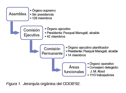 La Comisión Ejecutiva y la Asamblea General del COOB’92 eran dos órganos fundamentales para gobernar el comité pues suponían los dos principales elementos de gobierno. Poseían un profundo carácter político pues estaban formados por un equilibrio desigual de las diversas instituciones miembro. Es ilustrativo que el presidente del COOB’92 fuera el alcalde Pasqual Maragall, mientras que había tres vicepresidentes: Carles Ferrer Salat (presidente del COE), Javier Gómez Navarro (secretario de Estado de Deporte) y Josep Lluís Vilaseca (secretario general de Deporte de la Generalidad). Es decir, la máxima autoridad municipal sobresalía sobre los representantes de las otras tres instituciones principales. Ellos cuatro formaban parte de la Comisión Ejecutiva junto a 7 representantes del Ayuntamiento, 5 del COE, 5 del Gobierno de España, 5 de la Generalidad de Cataluña, 2 de la ONCE3 y los 3 directores generales del COOB’92 (Cuyàs, 1992).