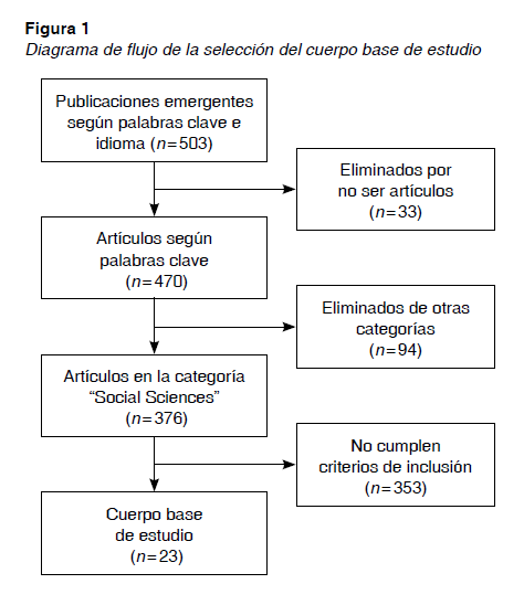 La población de artículos científicos fijada para este estudio fue de 503 documentos extraídos del repositorio de datos WOS. La muestra que compuso el cuerpo base de esta revisión sistemática se corresponde con 23 publicaciones de carácter científico, consideradas tras aplicar los criterios de inclusión y codificación. (Figura 1)
