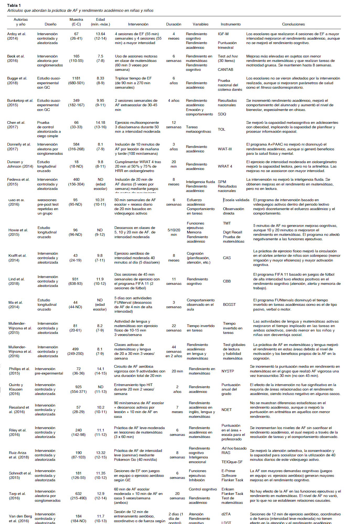 La tabla 1 muestra los resultados obtenidos una vez realizada la revisión sistemática aplicando los criterios de búsqueda descritos y analizando la asociación entre práctica de AF y rendimiento académico en niñas y niños y preadolescentes en edad escolar. Aglutinando la muestra de cada trabajo, se obtuvo una participación total de 7160 sujetos con edades comprendidas entre los 7 y 15 años de edad. Todos participaron en estudios longitudinales de diversa tipología con algún tipo de control con el fin de comprobar relaciones causales entre diferentes modos de práctica de AF, el rendimiento académico y diversos factores vinculados al mismo como son la capacidad de atención, las funciones ejecutivas o el rendimiento cognitivo. Para la extracción de la información en la revisión sistemática se siguió la siguiente codificación: 1) Autorías y año de publicación; 2) Diseño metodológico del estudio; 3) Muestra y desglose de la misma en grupo experimental (GE) y grupo control (GC); 4) Edad mínima, máxima y media; 5) Descripción básica de la intervención realizada en cuanto a carga y volumen del ejercicio; 6) Duración de la intervención; 7) Variables dependientes consideradas en el estudio de tipo longitudinal (rendimiento académico, atención, etc); 8) Instrumentos empleados para la valoración de las variables dependientes y, 9) Conclusiones y hallazgos.