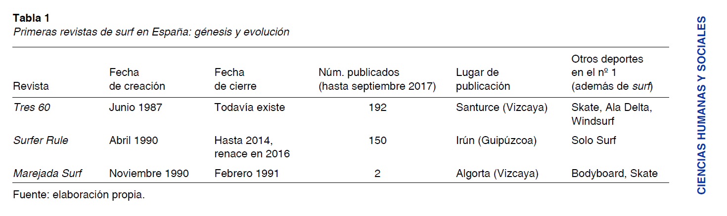 Más de una década después surgieron las primeras revistas de surf en España: entre 1987 y 1990. Fueron tres: Tres 60 (1987), Surfer Rule (1990) y Marejada Surf (1990). A partir de 1992 aparecieron otras revistas de ámbito regional, como Rompeolas en Canarias o Surfari en Galicia, pero solo se examinan en este trabajo revistas de tirada nacional. En este apartado, con el fin de ordenar y estructurar la información, se han creado las siguientes categorías: 1) Génesis, frecuencia de la tirada, equipo editorial y colaboraciones; 2) Contenidos de los deportes que incluye la revista; 3) Contenido general de los temas, y, 4) Evolución de la revista.