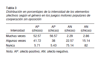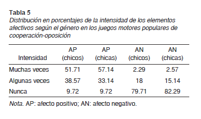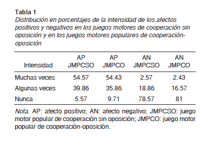 El panorama general en función de los AP y AN se presenta en la tabla 1, donde se puede observar que el ítem “muchas veces” de los afectos positivos obtuvo la mayor percepción en los dos tipos de juego motor y lo mismo sucede con la intensidad ‘’nunca’’ en los afectos negativos, por lo tanto se puede señalar que la percepción del AP en los juegos populares se encuentra presente en mayor medida que los AN. Las diferencias encontradas entre los juegos populares según su interacción motriz son que el alumnado en los de cooperación sin oposición percibió un mayor AP que en los de cooperación-oposición. No obstante, en los de cooperación-oposición, el alumnado percibió menor AN que en los juegos de cooperación sin oposición.