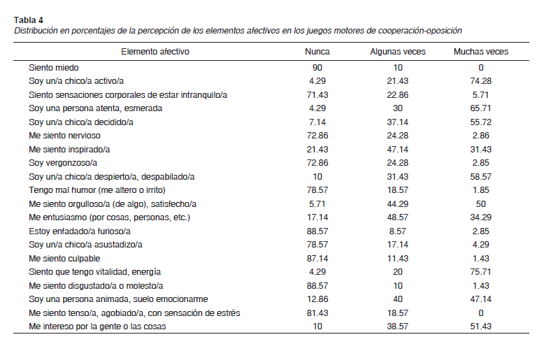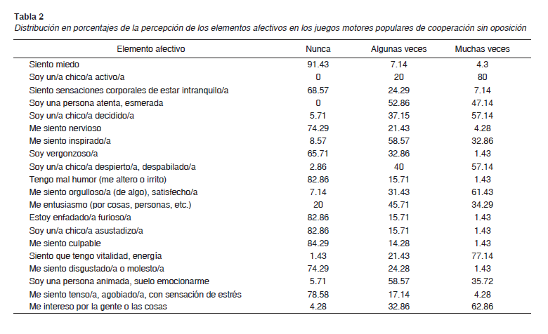 Los resultados de la percepción afectiva durante los juegos populares de cooperación sin oposición se presentan en la tabla 2, donde se identifica que los AP fueron más percibidos en la intensidad “muchas veces” con respecto a los AN. La mayor intensidad del AP percibido se presenta en el elemento del estado de vitalidad y del interés por el entorno social y ambiental. Además, el alumnado apreció también el orgullo con un porcentaje elevado, lo que puede tener relación con el conocimiento y la identificación con el juego motor. A pesar de que los afectos positivos tuvieron la preferencia en la percepción afectiva, hay tres elementos que concentran la percepción en la intensidad “algunas veces”, y son: la atención, el entusiasmo y la animación en el juego, indicadores que se relacionaron con el interés y la motivación en los juegos.